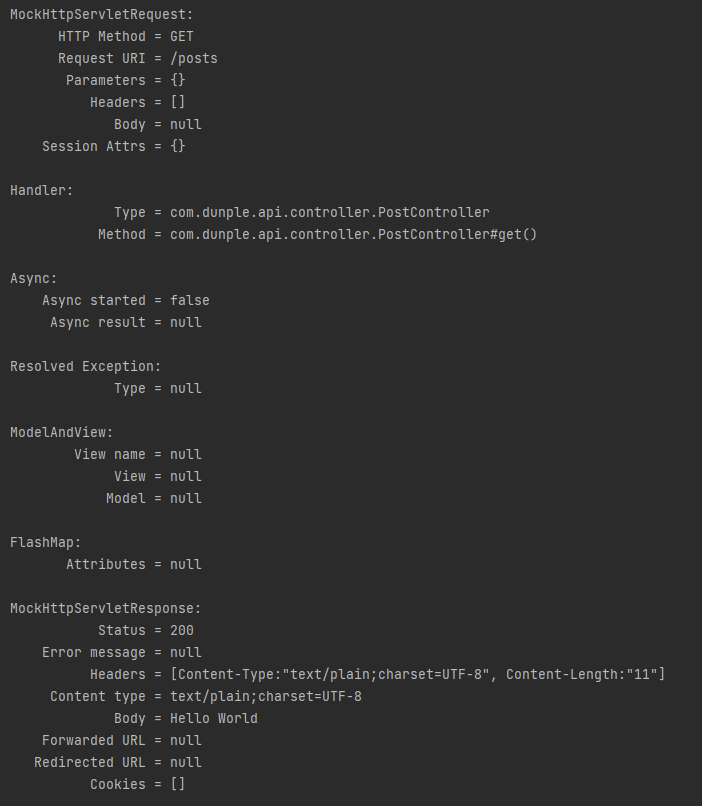 테스트는 성공하고 .andDo(print()) 를 추가해서 위 사진같이 요청과 결과의 상세 내역을 표시해준다.