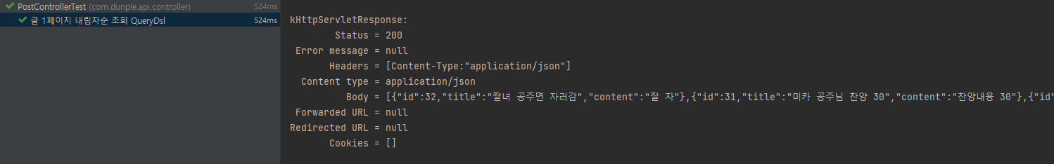 JSON 응답으로 내려온 Post 갯수 및 title, content 내용을 확인하는 테스트를 작성한다.