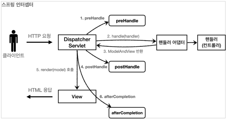 스프링 인터셉터의 흐름은 위와 같다. 스프링을 사용하기 때문에 위 흐름에서 표시된 서블릿은 DispatcherServlet 이다.