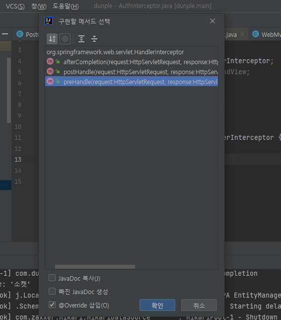 윈도우 기준 ctrl + i 를 누르면 구현할 수 있는 아래 사진처럼 메서드 목록이 나온다.