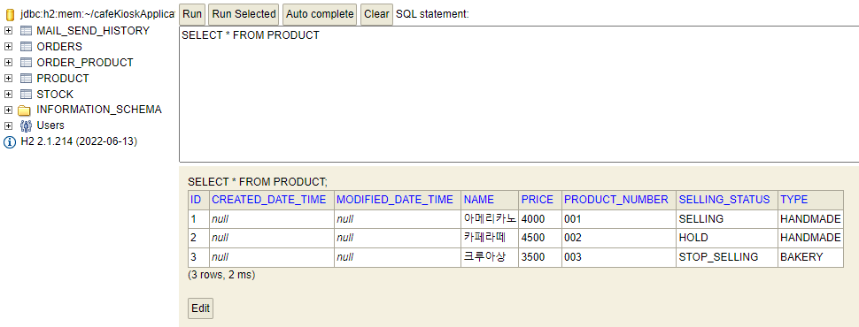 H2 데이터베이스로 들어가면 아래처럼 데이터가 들어가 있음을 확인할 수 있다.