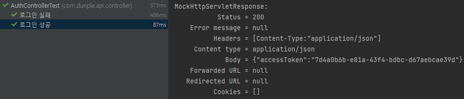 테스트는 성공하고 성공 시 응답값으로 세션토큰 또한 발급되는걸 확인할 수 있다.