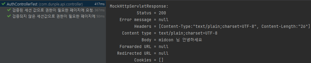 테스트를 수행하면 성공하며 인증 성공 시 UserSession 에 담긴 이름으로 응답이 오는걸 확인할 수 있다.