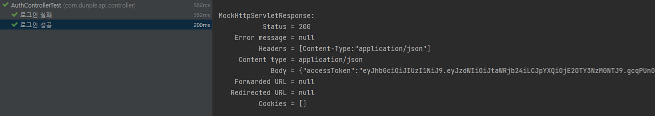 로그인의 성공, 실패 테스트를 실행하고 body 에 JWT 가 응답으로 내려왔는지 확인하는 테스트를 작성한다.