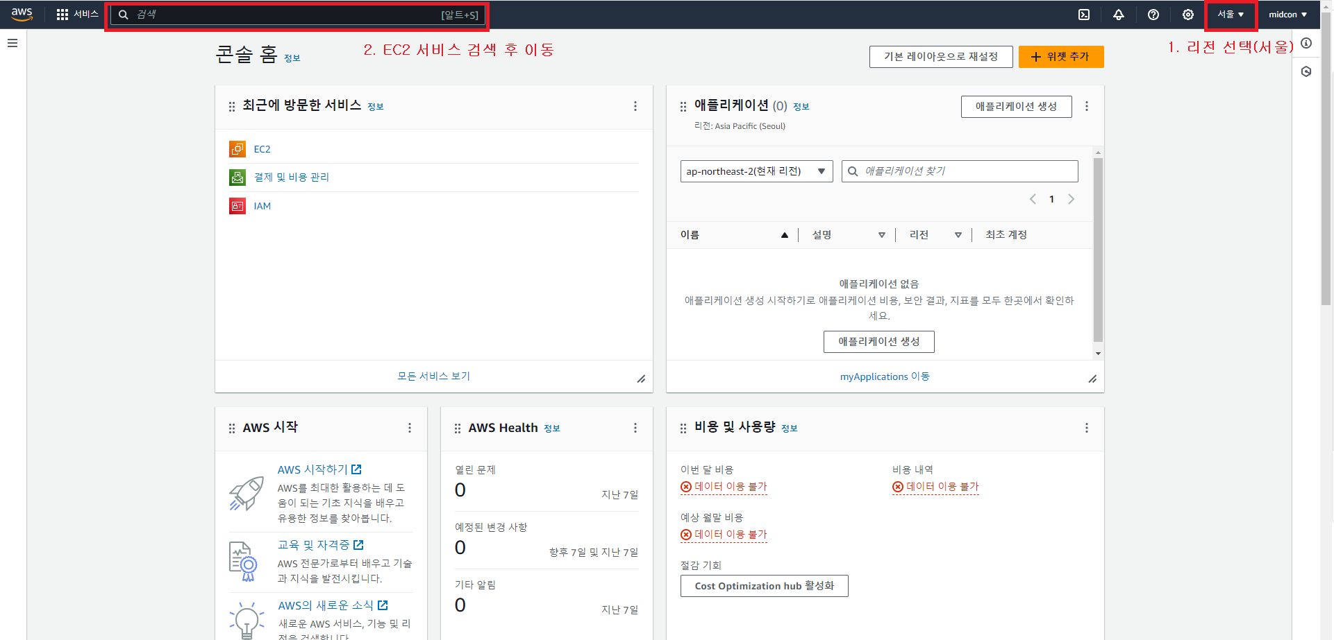 1-1. AWS Region 선택 후 EC2 탭으로 이동