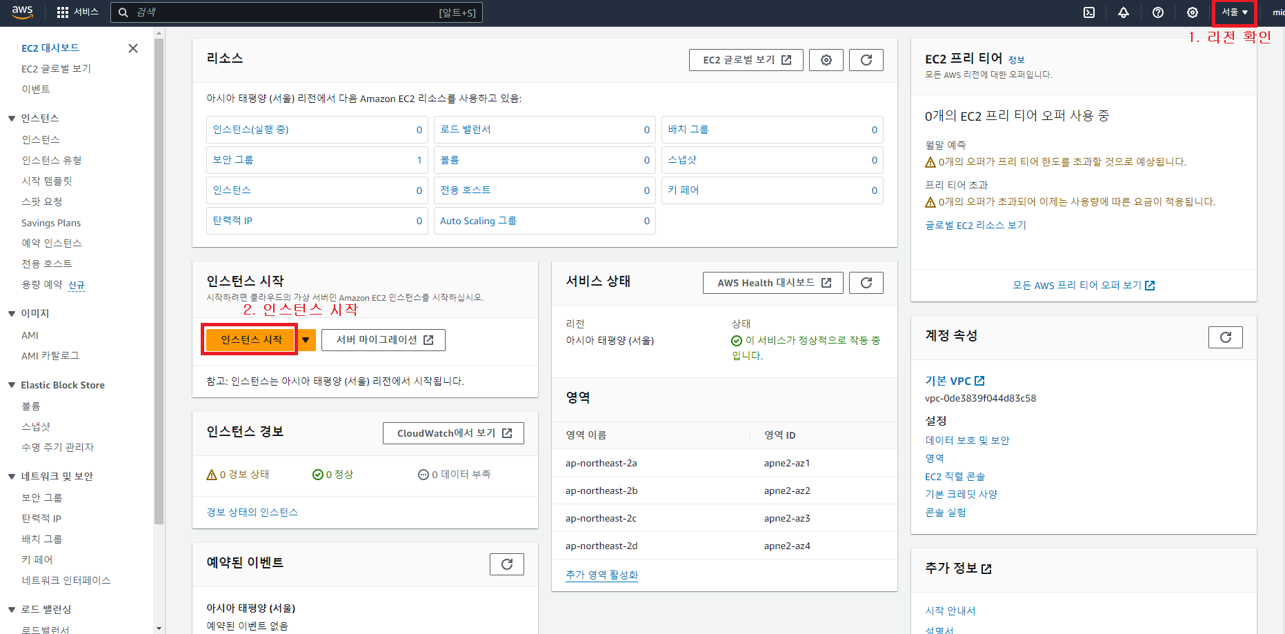 1-2. 리전 확인 후 인스턴스 시작