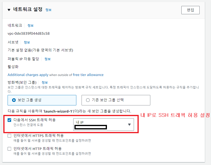 내 IP에서 SSH 연결을 할 수 있도록 보안 그룹을 생성해서 등록한다.