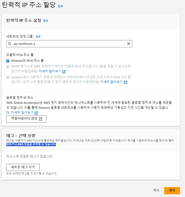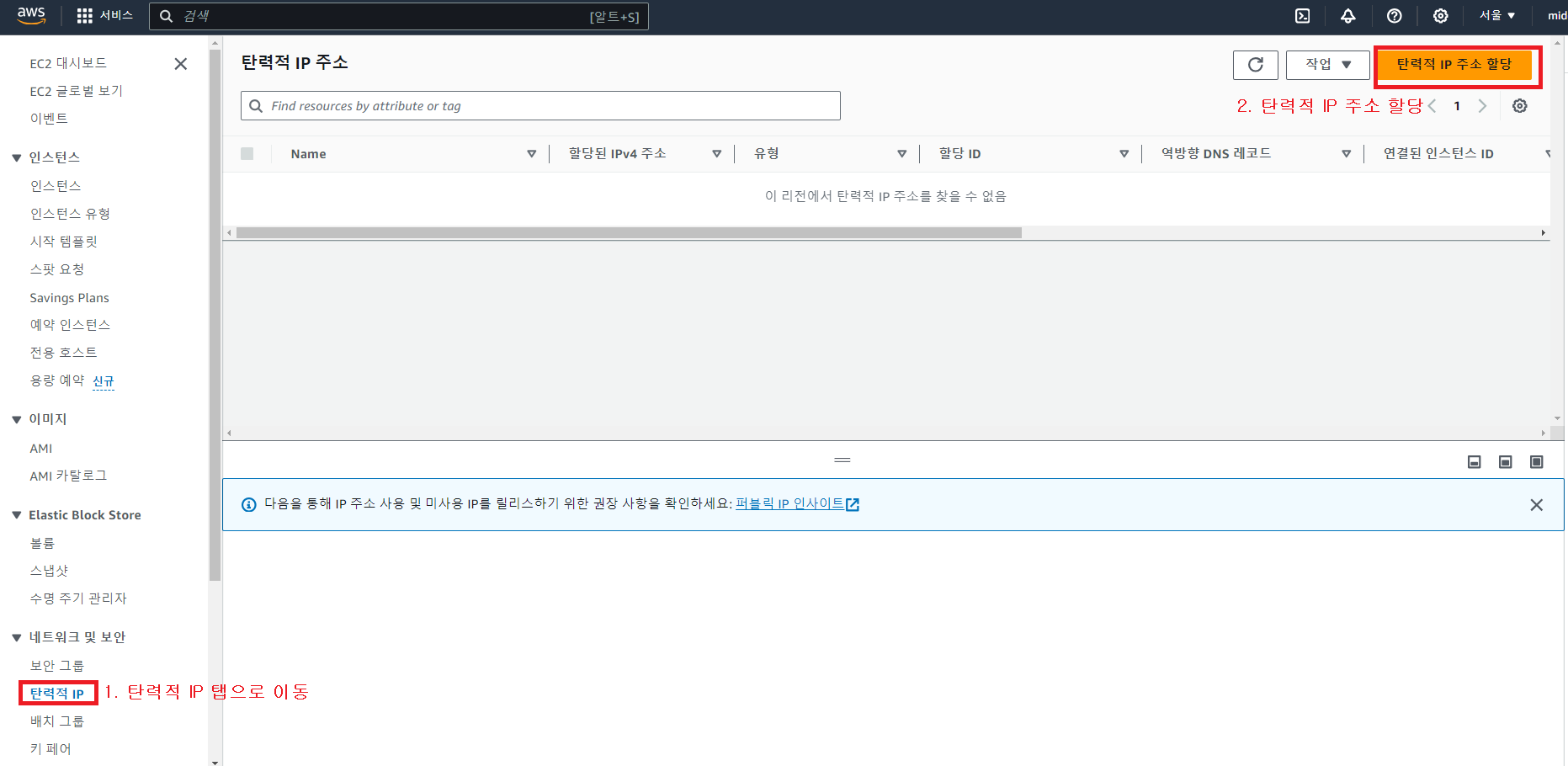 1-1. 탄력적 IP 탭으로 이동 후 탄력적 IP 주소 할당