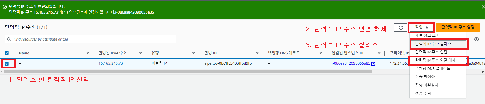 탄력적 IP 주소 연결 해제 후 릴리즈 하면 된다.