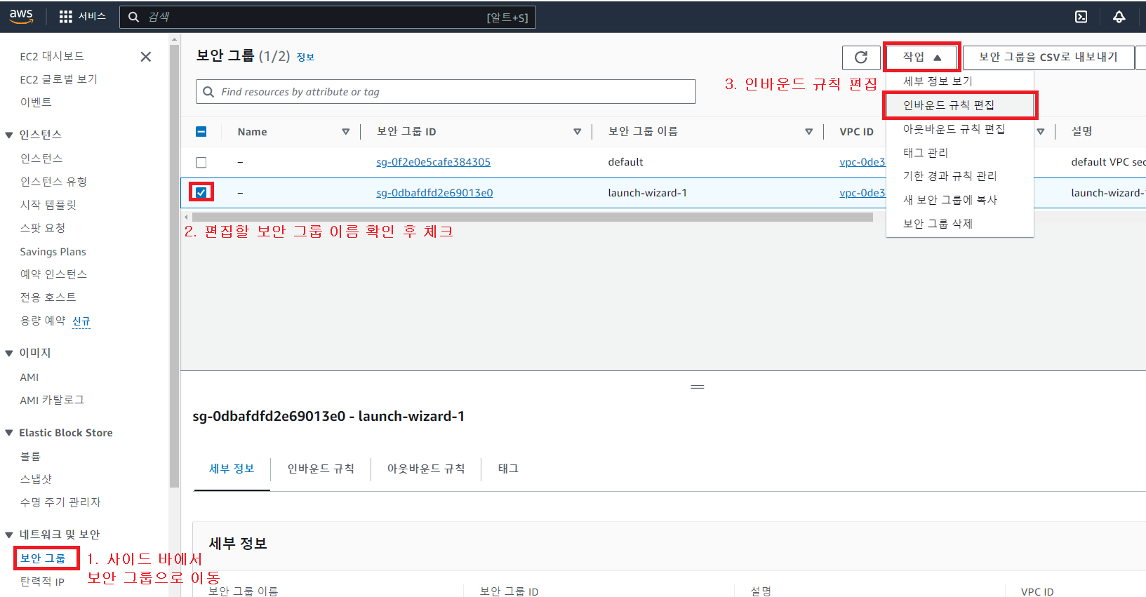 1-2. 사이드 바에서 보안 그룹으로 이동 후 편집 창으로 이동