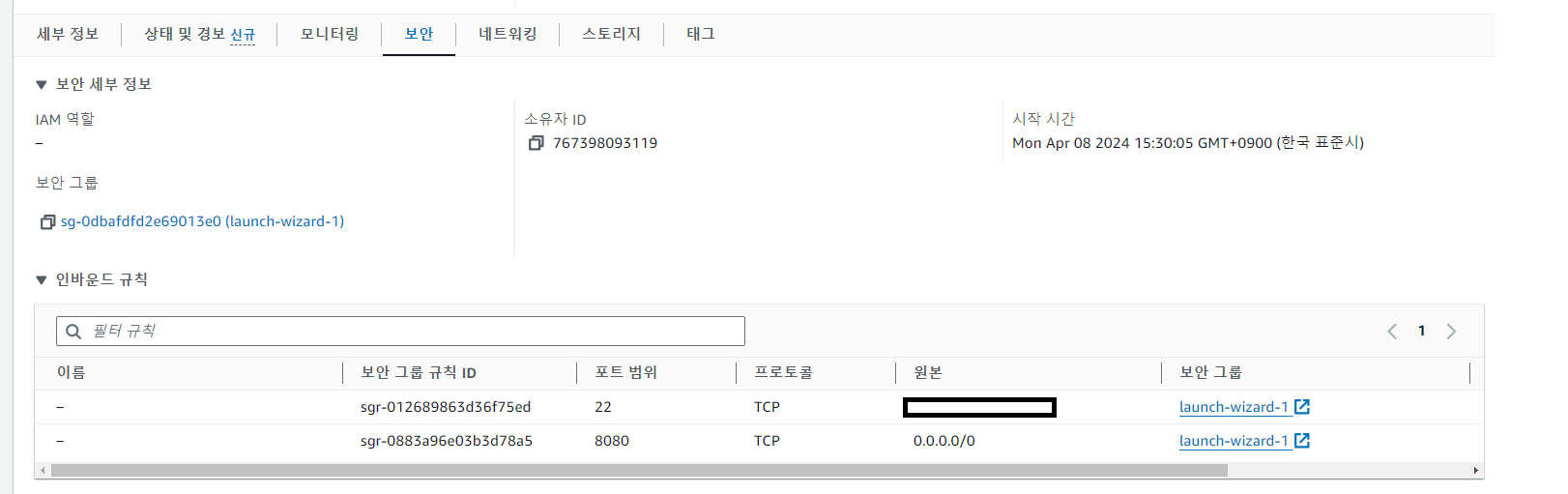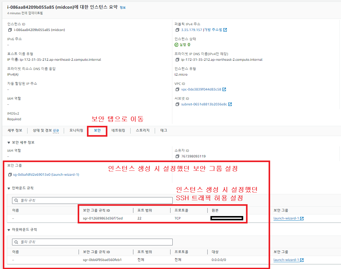EC2 인스턴스 정보에서 보안 규칙이 잘 변경 됐는지 확인한다.