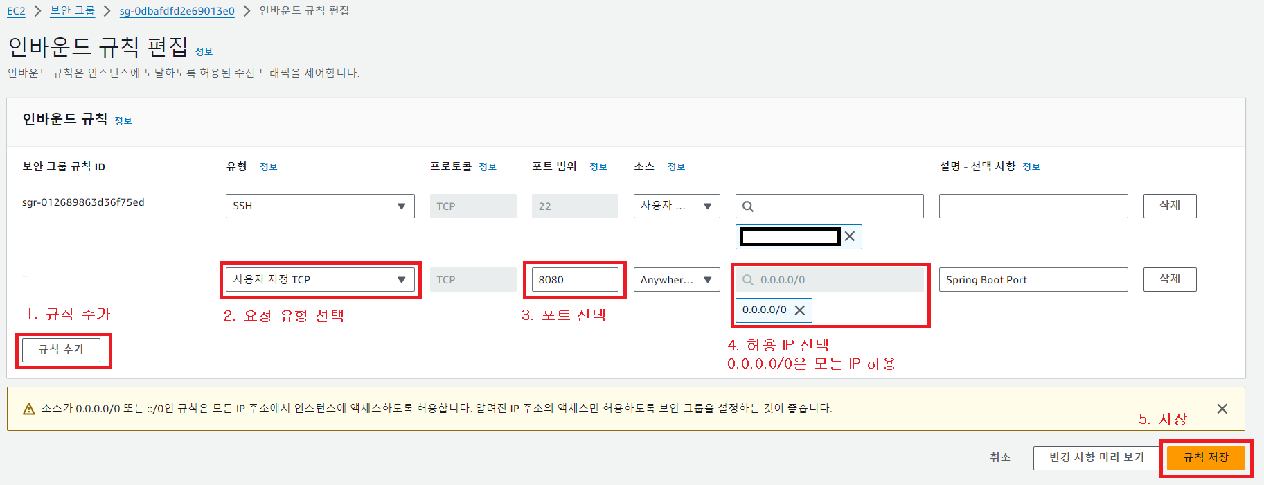 (본인은 스프링 부트 서버를 8082 포트로 열어서 인바운드 규칙을 8082로 바꿨다.)