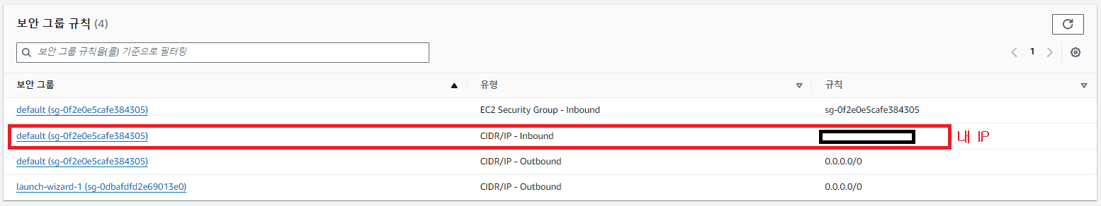 이 글에서는 생성할 때 추가해둔 default 보안 그룹을 수정해서 로컬에서 접근할 수 있도록 할 것이다.