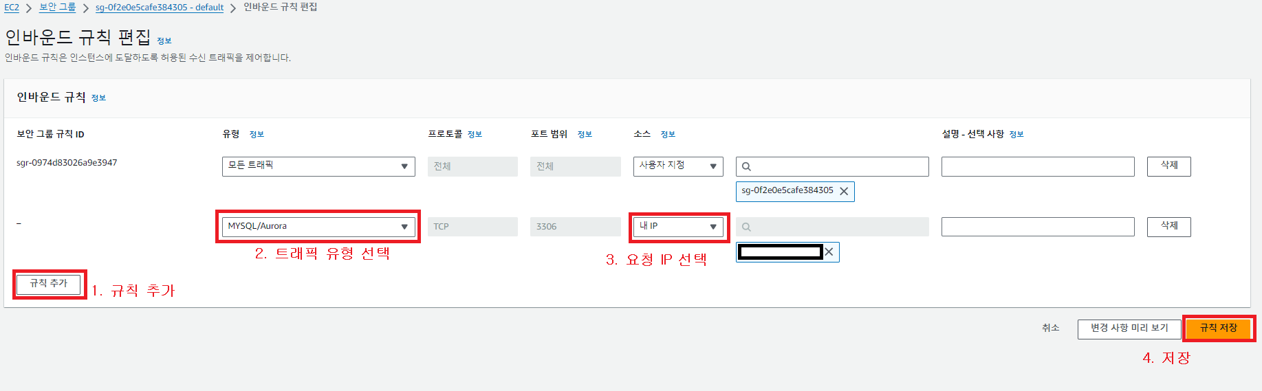 로컬에서 RDS에 접근할 수 있게 인바운드 규칙에 아래처럼 내 IP를 추가한다.