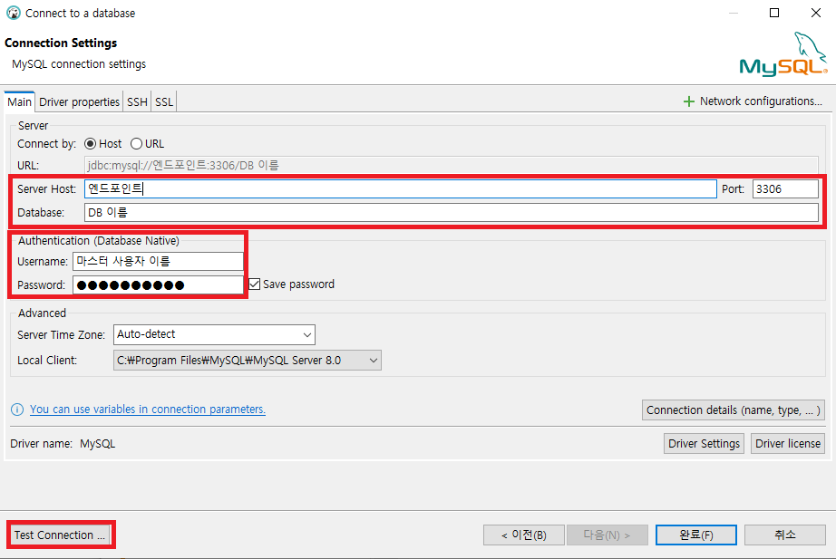 이제 엔드포인트, 포트번호, DB 이름, 사용자 이름, 비밀번호를 입력하면 된다.