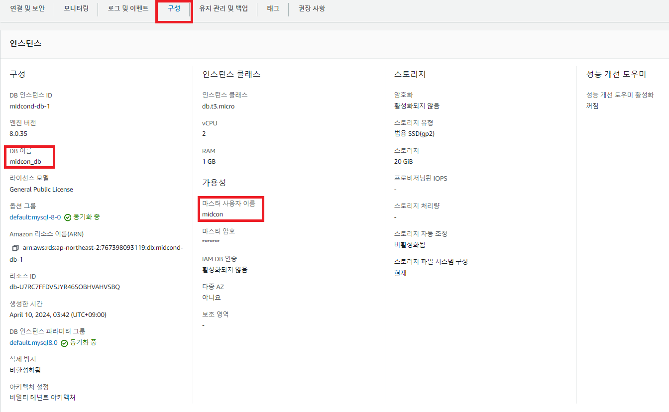 DB 이름과 마스터 사용자 이름은 RDS 구성 탭에서 확인할 수 있다.
