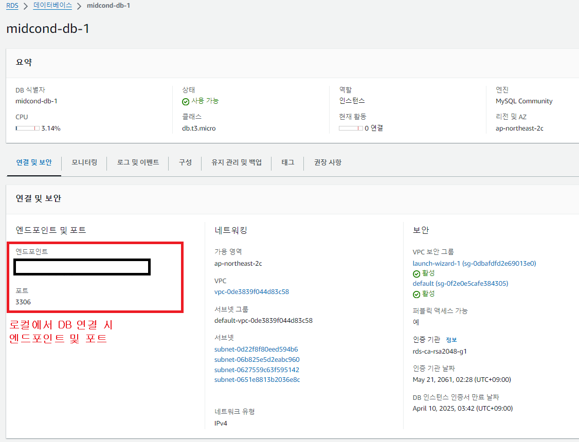 엔드포인트와 포트번호는 RDS 연결 및 보안 탭에서 확인할 수 있다.