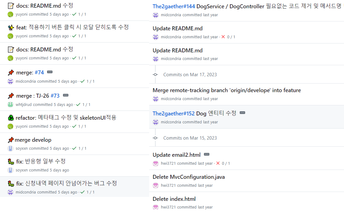 커밋 컨벤션을 지키면서 작성한 왼쪽이 더 깔끔해 보이는것 같다.