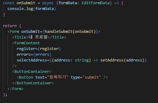 아래처럼 제출 시 동작할 onSubmit 함수를 만들어서 사용한다.