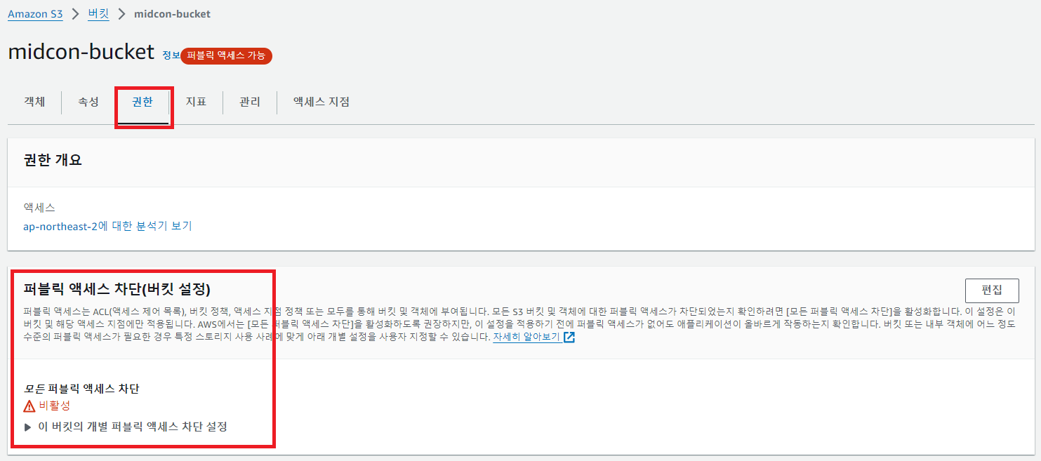생성한 이미지 저장용 S3 버킷으로 이동하고 권한 탭으로 이동한다.