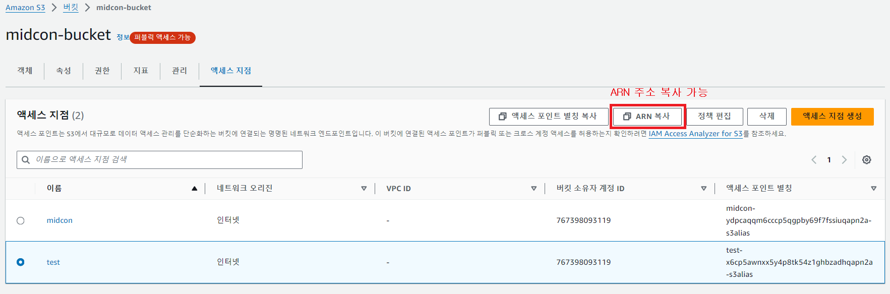 ARN 주소는 아래처럼 액세스 포인트를 선택하고 복사할 수 있다.