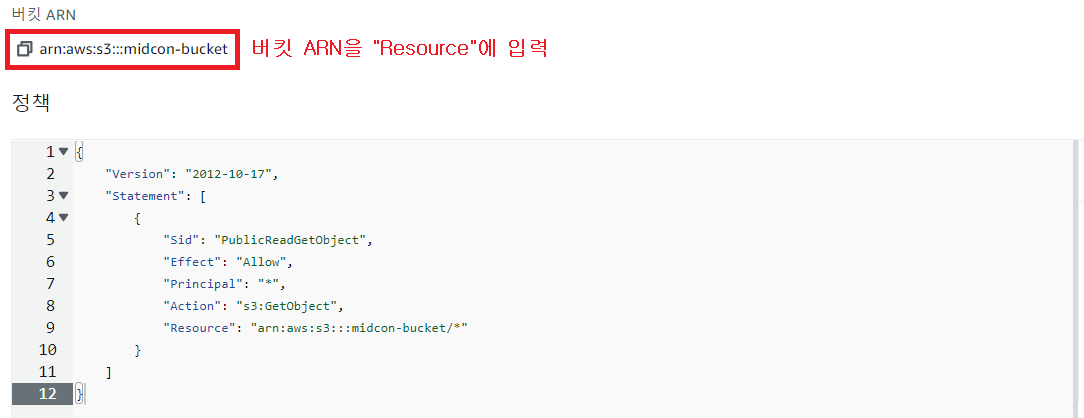 참고로 버킷 ARN은 편집하기를 누르면 편집창 위에서 확인할 수 있다.