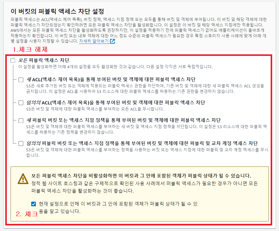여기서는 모든 퍼블릭 엑세스를 차단한다고 설정 돼있는데, 버킷이 모든 퍼블릭 엑세스를 허용해서 그런지 기본 값으로 해도 상관 없는듯 하다.