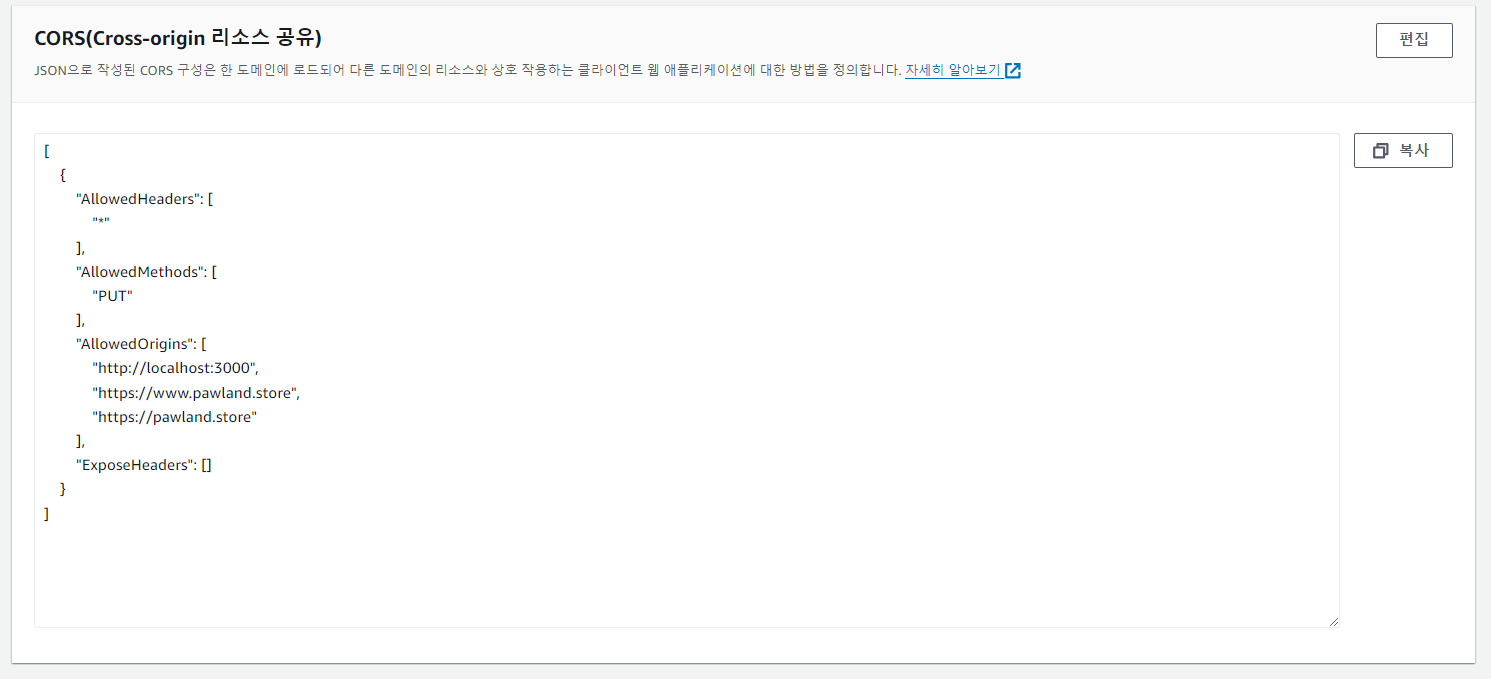 아래처럼 S3 버킷에 들어가서 권한 탭에서 CORS 설정을 해주도록 한다.
