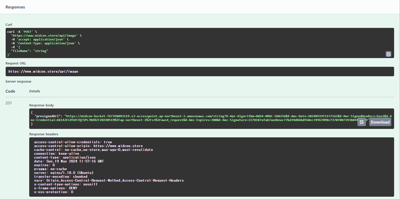 - 백엔드는 요청 받은 이미지 파일명으로 S3 버킷에 저장할 수 있는 프리사인 URL을 발급한다.