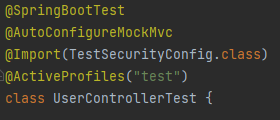 테스트 클래스에 아래 스크린샷처럼 @Import(TestSecurityConfig.class), @ActiveProfiles("test") 를 붙여준다.