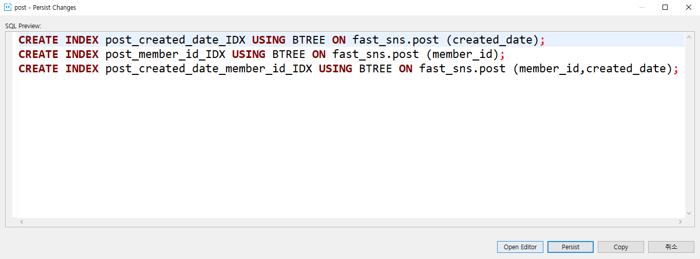 본인은 아래처럼 GUI로 3개의 인덱스를 추가해줬다.
