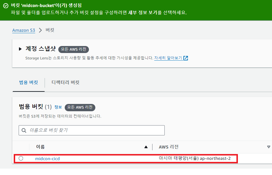 이전 글에서 이미지 저장소를 만들 때도 썼던 그 S3인데, CI/CD 용 버킷을 새로 만들어서 사용한다.