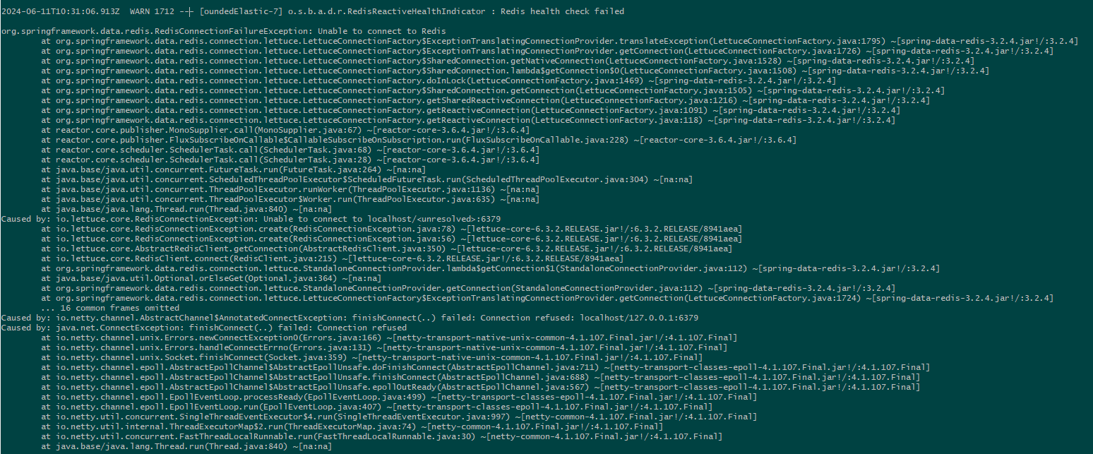 [oundedElastic-7] o.s.b.a.d.r.RedisReactiveHealthIndicator : Redis health check failed org.springframework.data.redis.RedisConnectionFailureException: Unable to connect to Redis