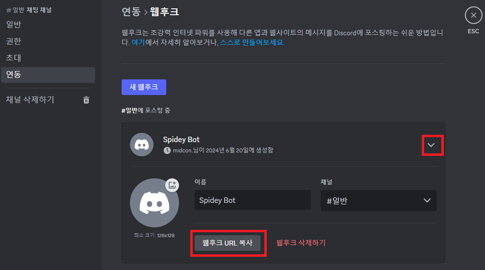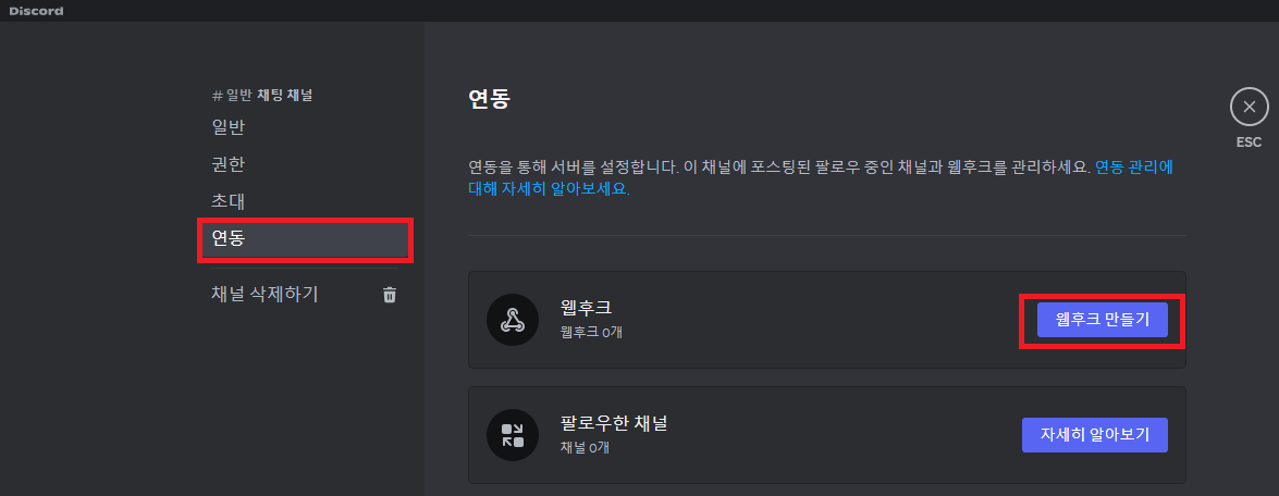 디스코드와 연동하려면 디스코드의 웹 훅을 만들어둬야 한다.