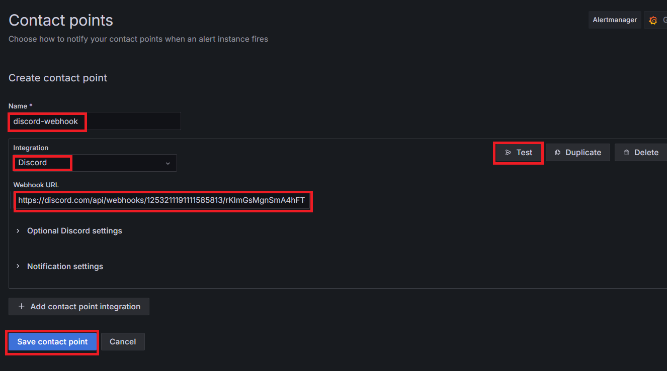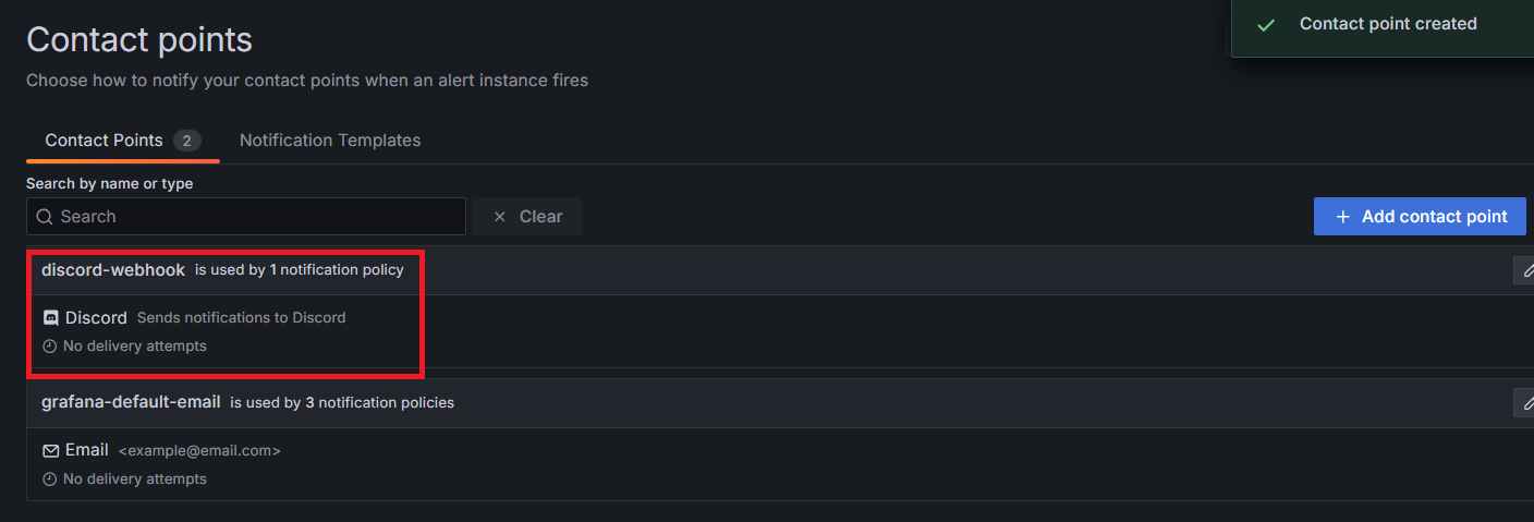 저장 후 Contact points 페이지로 이동하면 우리가 추가한 디스코드 웹 훅이 등록되었음을 확인할 수 있다.