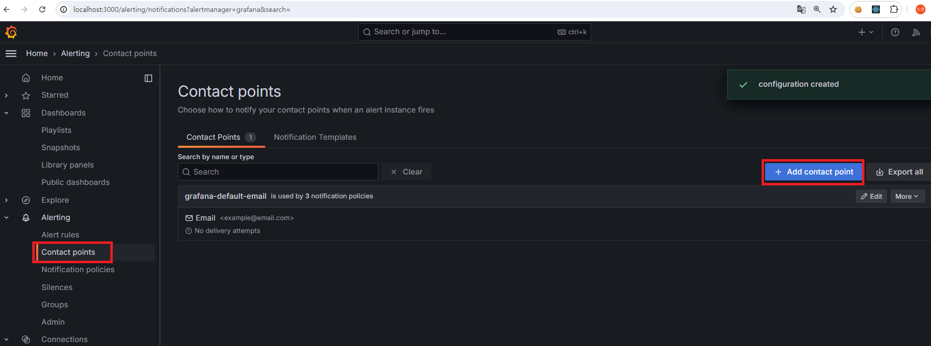 그라파나의 기본 포트인 localhost:3000으로 접속하고 Alerting 탭에서 Contact point 페이지로 이동하면 아래와 같다.
