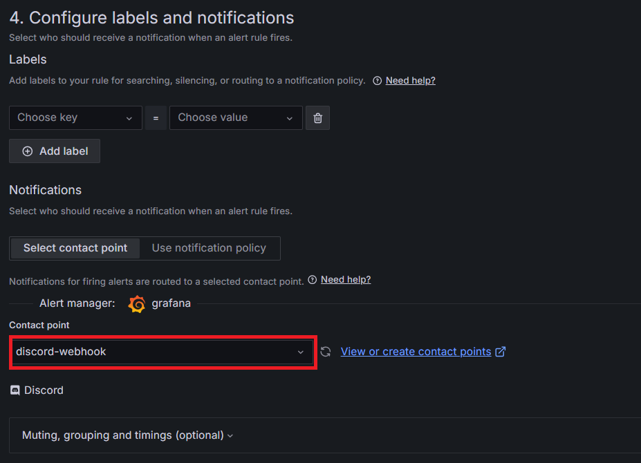 연동한 디스코드 웹 훅 경로로 메시지를 보내도록 Contact point를 지정한다.