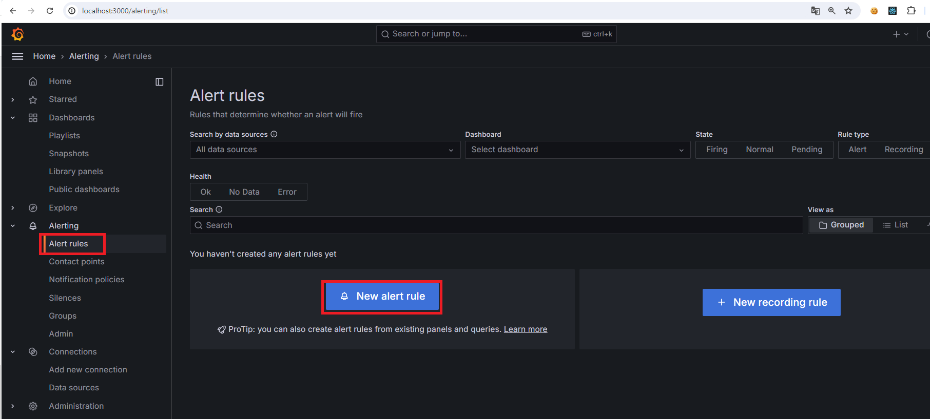 Alerting 탭에서 Alert rules 페이지로 이동하여 새로운 규칙을 추가한다.