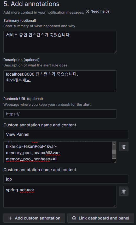 본인은 job 이름과 스프링부트 애플리케이션 상태를 확인할 수 있는 패널 경로를 넣어주었다.
