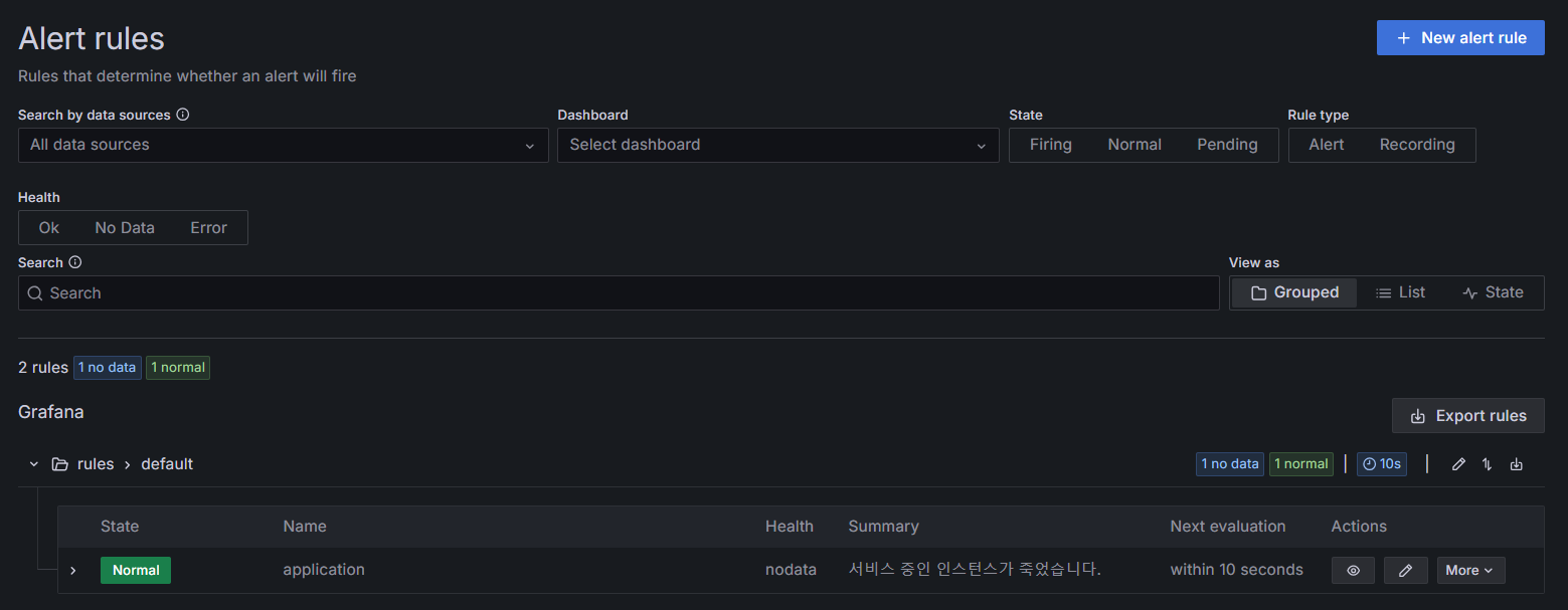 여기까지 설정 했으면 우상단의 저장 버튼을 누르면 Alert rule이 추가되고, 아래처럼 추가된 Alert rule을 확인할 수 있다.