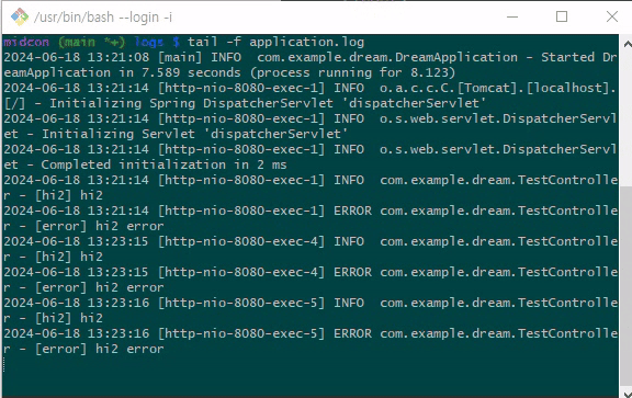 ex) 2024-06-18 13:24:59 [http-nio-8080-exec-9] ERROR cohttp://m.example.dream.TestController - [error] hi2 error