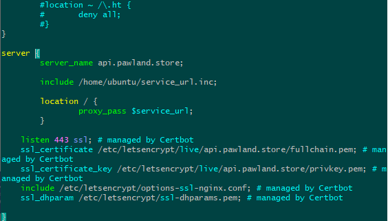 아래처럼 certbot이 nginx 설정까지 자동으로 변경한 알 수 있다.