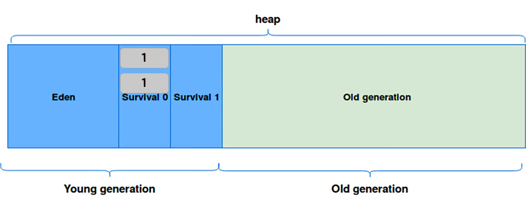 (survival 영역 0, 1 중 둘 중 하나는 비어있고, Minor GC 마다 둘 중의 한 영역으로 이동 시킨다.)