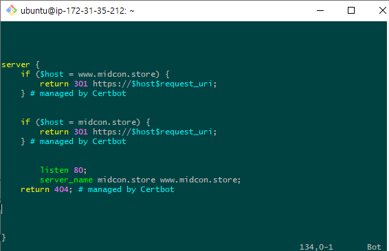 아래처럼 certbot이 nginx 설정까지 자동으로 변경한 알 수 있다.