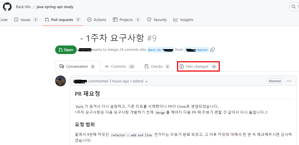 1. 리뷰어로 참여하고자 하는 PR 에 들어가서 Files changed 를 누른다.