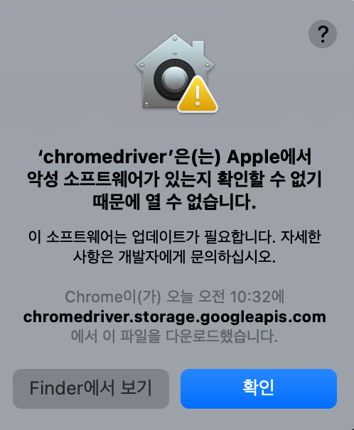 - 경고창이 뜨면서 크롬 드라이버를 사용할 수 없다.