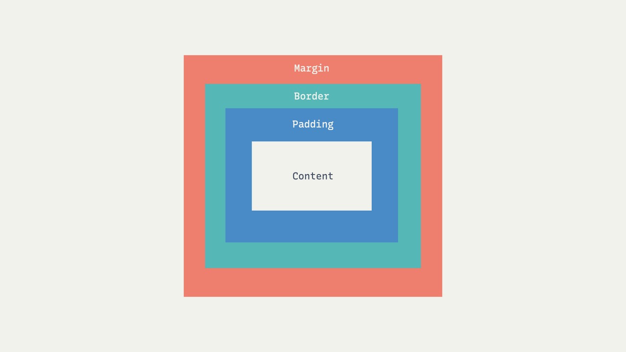 밖에서부터 차례대로 바깥 여백인 마진, 테두리인 보더, 테두리와 실제 내용 사이의 여백인 패딩,