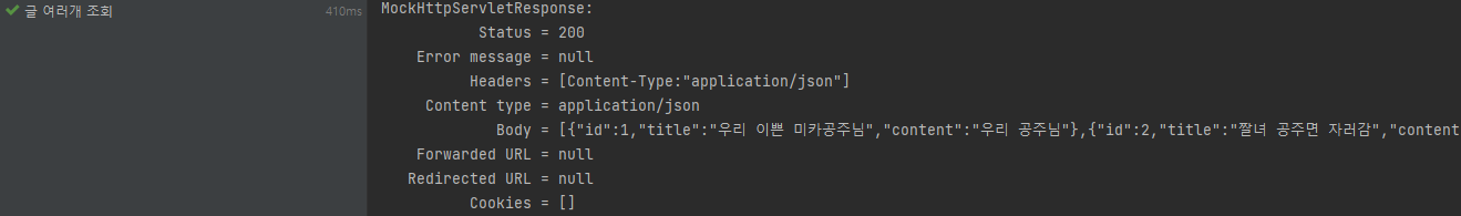 JSON 응답을 위처럼 List<PostResponse> 의 형태로 내려주기 때문에 기존의 jsonPath 형태를 바꿔서 테스트를 해야한다.